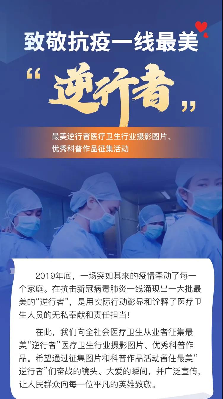 最美“逆行者”作品征集 2020-04-29 15:18:27 2020-04-29 15:04:02 admin 资讯快递 原创 收藏 欢迎医护人员扫描二维码报名报名时请加上 “《中国护理管理》杂志社推荐 ”点击填写作品报送表 “国泰”方能“民安”,福建省各地计生协多种活动提高群众国家安全意识 寻找最美“逆行者”公益宣传活动启动 您可能也喜欢 吴桂英:以人口高质... 本刊特约撰稿:凝心... 以家庭健康助推健康... 带娃是门技术活