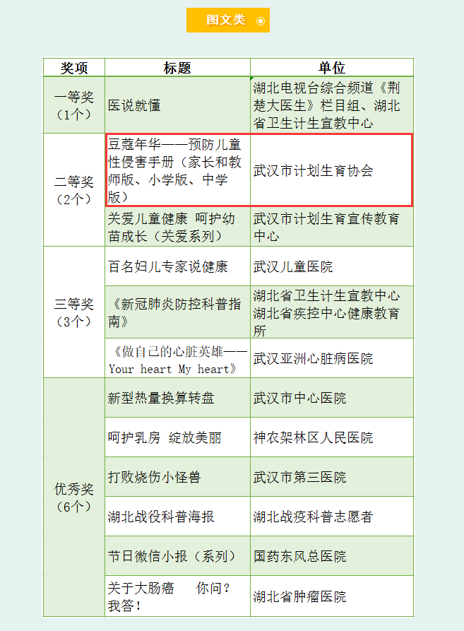 10月29日,由中共湖北省委宣传部、省卫生健康委、省科技厅、省科学技术协会联合主办的2020湖北省第二届健康科普大赛奖项公布,武汉市计生协选送的《豆蔻年华——预防儿童性侵害手册(家长和教师版、小学版、中学版)》获得图文类二等奖。
