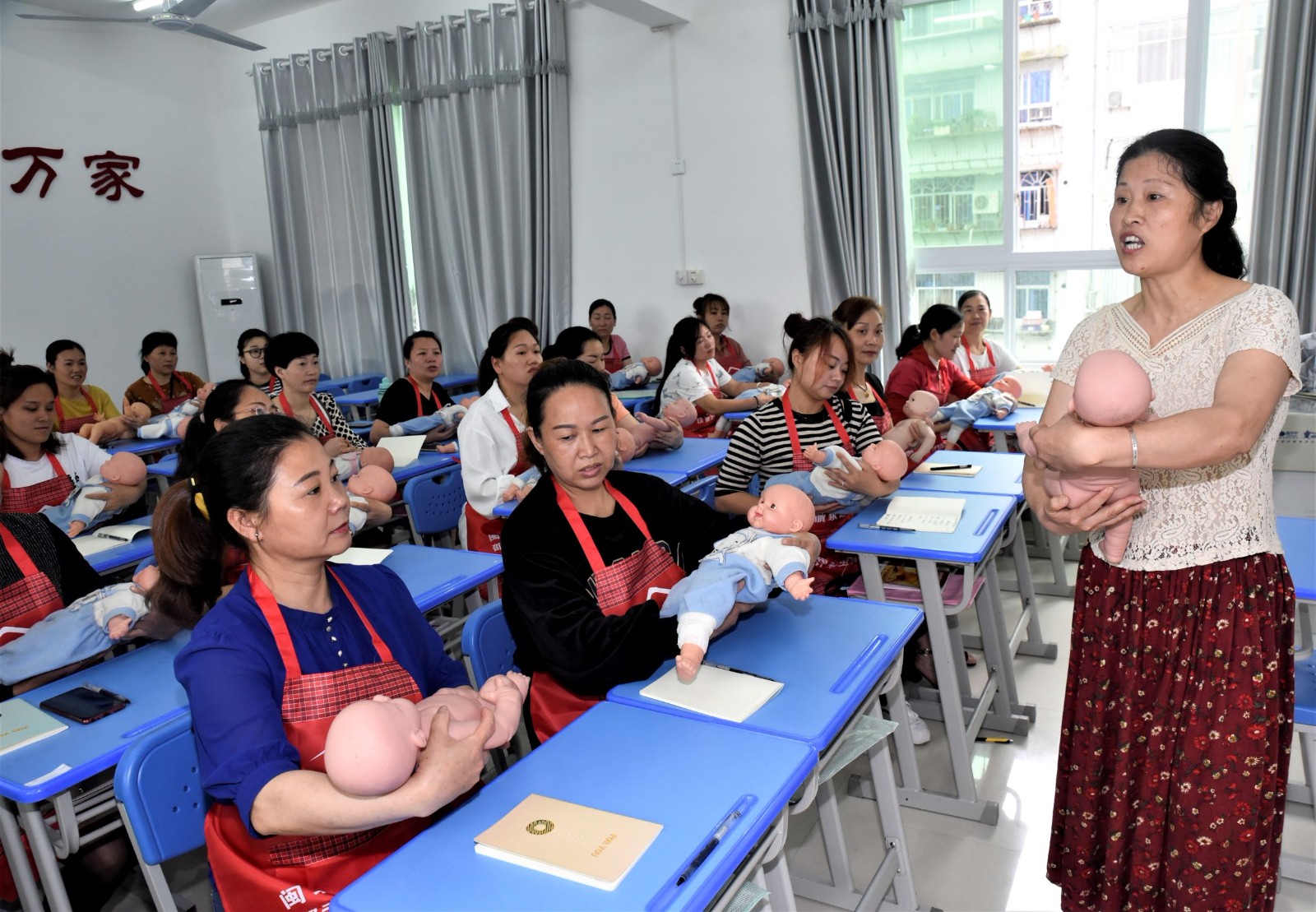 5月13日上午,福建省邵武市计生协、市妇联、市人社局、闽北技校共同举办的2019年首期育婴师技能培训班在闽北技校家政培训中心开班,城乡46名需就业的女性参加培训。此次培训由闽北技校、市妇幼保健院等专家授课,培训内容包括职业道德、孕产妇护理、婴幼儿健康喂养、婴幼儿生理发育、心理发育特点、婴幼儿生活照料方面的知识与技能,婴幼儿生长监测、常见病护理、意外伤害的预防与处理等日常生活保健与护理的内容,还包括婴幼儿语言能力、认知能力、情绪行为能力等教育方面等专业知识,通过面授、实操、实践、录像、教辅,采取理论与实践相结合的教学方法。培训结束后,组织学员统一考试,成绩合格者发放人社部门育婴师技能资格证书。育婴师技能培训每期时间为15天,培训费用由市计生协承担。